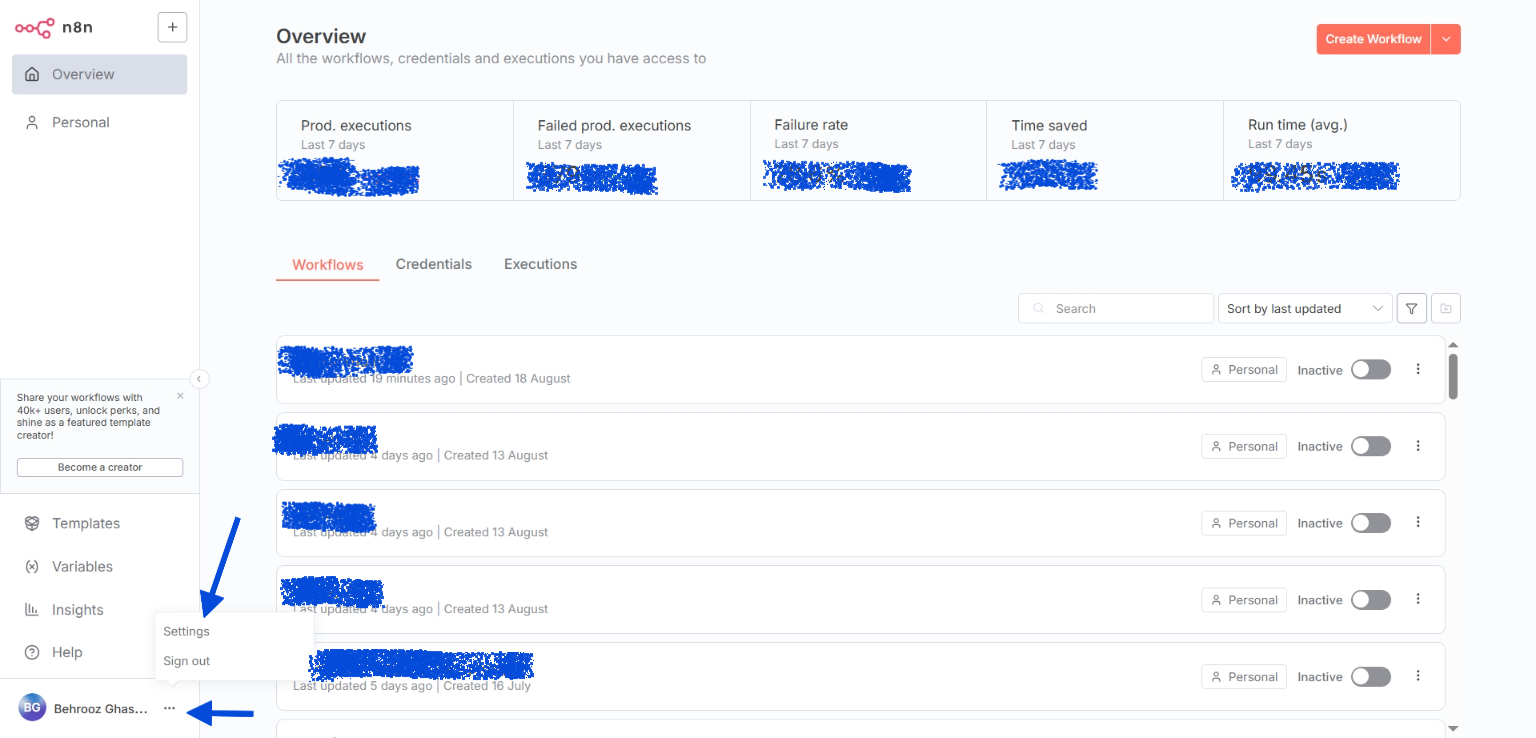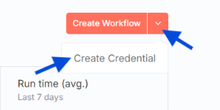 - دسترسی به بخش Credentials: در گوشه بالا و سمت راست صفحه Overview در n8n، روی فلش کنار دکمه قرمز رنگ کلیک کنید.