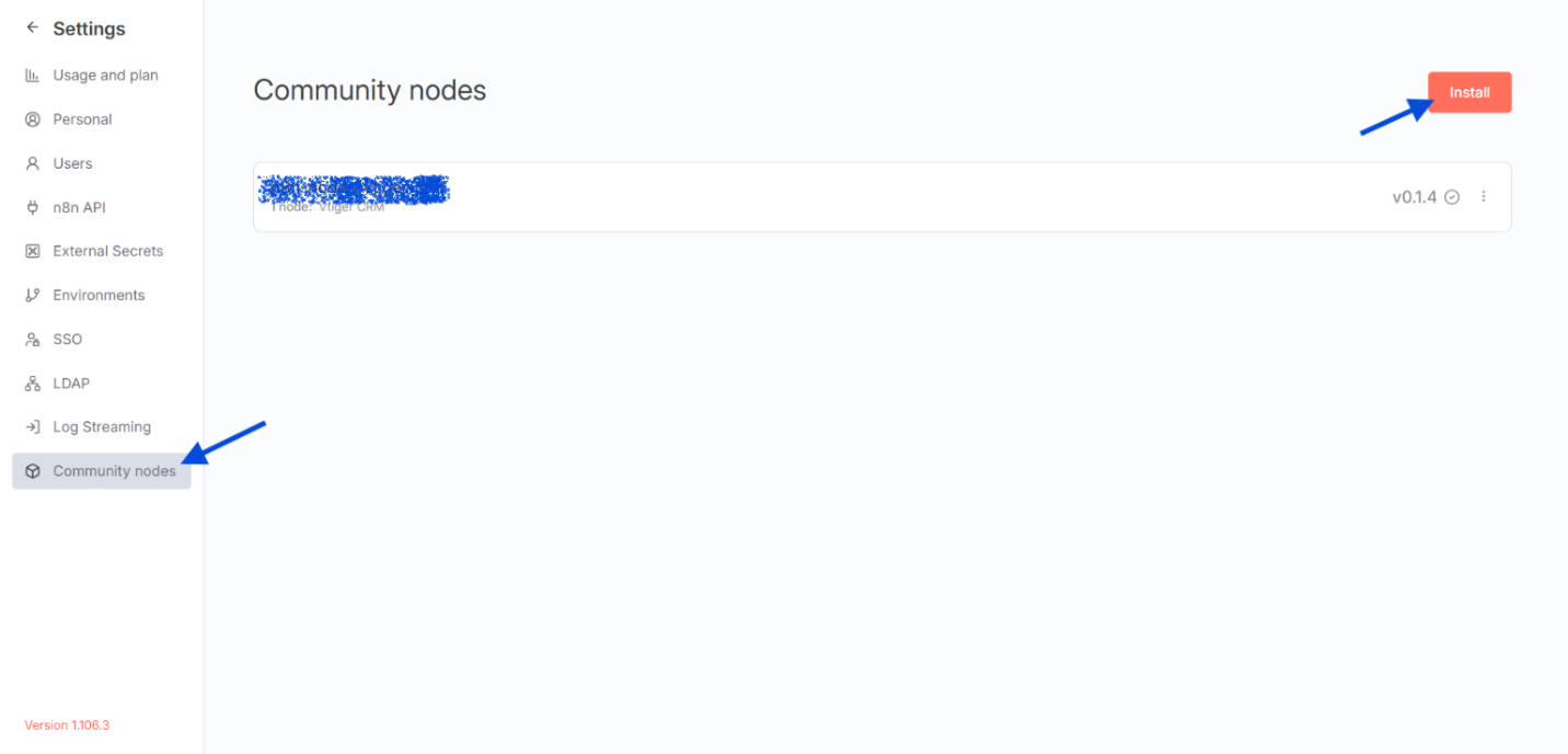 - ورود به تنظیمات: ابتدا در محیط n8n، به مسیر Settings > Community Nodes بروید.