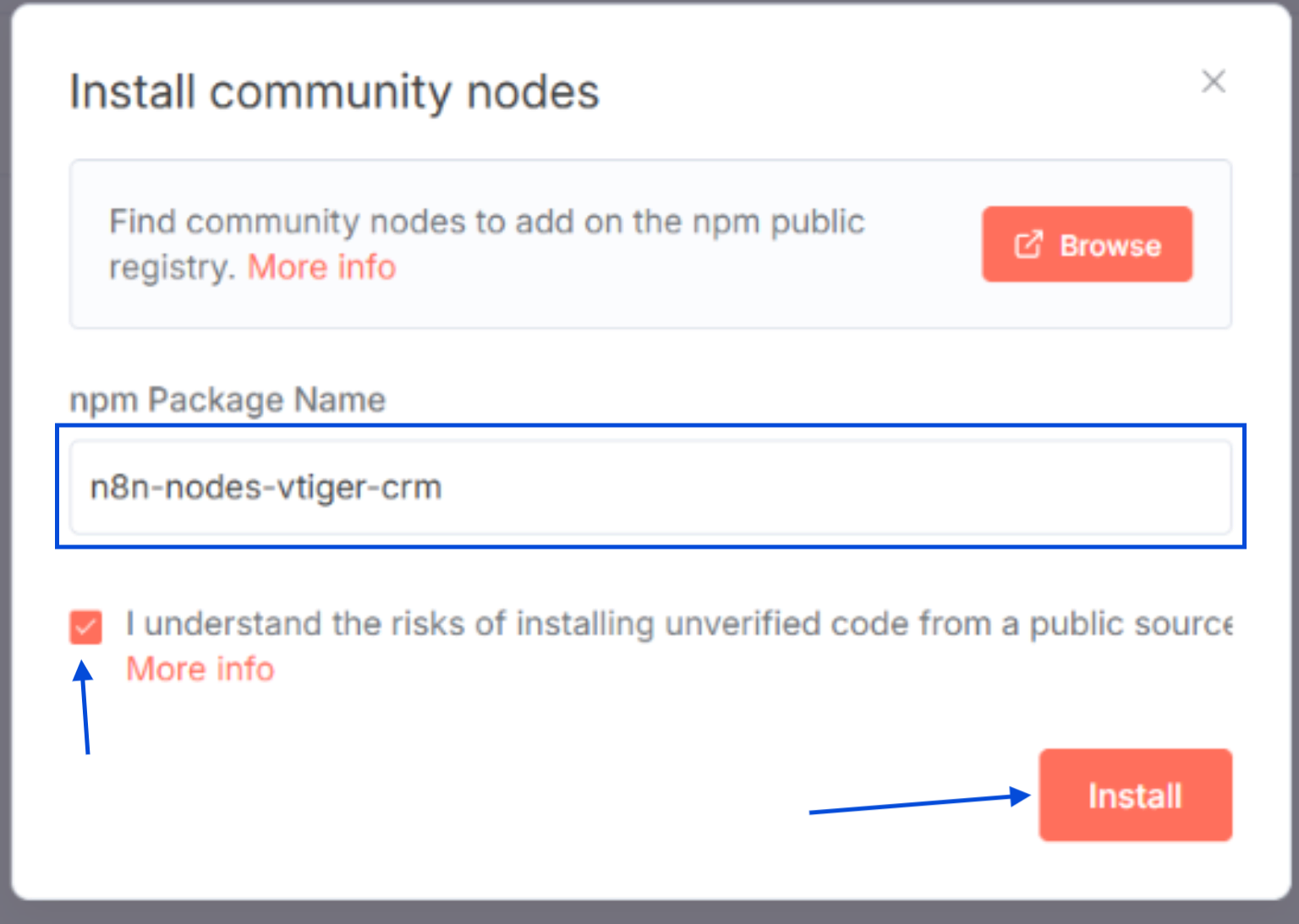 را در بخش Enter npm package name وارد کنید. این نام، شناسه بسته در مخزن npm است که n8n از آنجا گره مورد نظر ما را پیدا و نصب میکند. - تأیید ریسک: گزینه I understand the risks of installing unverified code from a public source را انتخاب کنید. این یک گام ضروری است، چون n8n برای حفظ امنیت از شما میخواهد که آگاه باشید که در حال نصب کدی از یک منبع عمومی هستید.