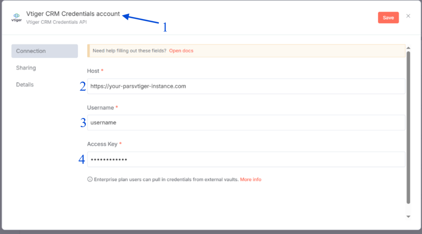 - نام (Name): ابتدا یک نام واضح و گویا برای این اتصال انتخاب کنید (مثلاً “Vtiger Production” یا “Vtiger Dev”) تا در آینده به راحتی بتوانید آن را تشخیص دهید.آدرس (Host): URL کامل نرمافزار CRM پارس ویتایگر خود را در این بخش وارد کنید. فرمت باید حتماً به شکل